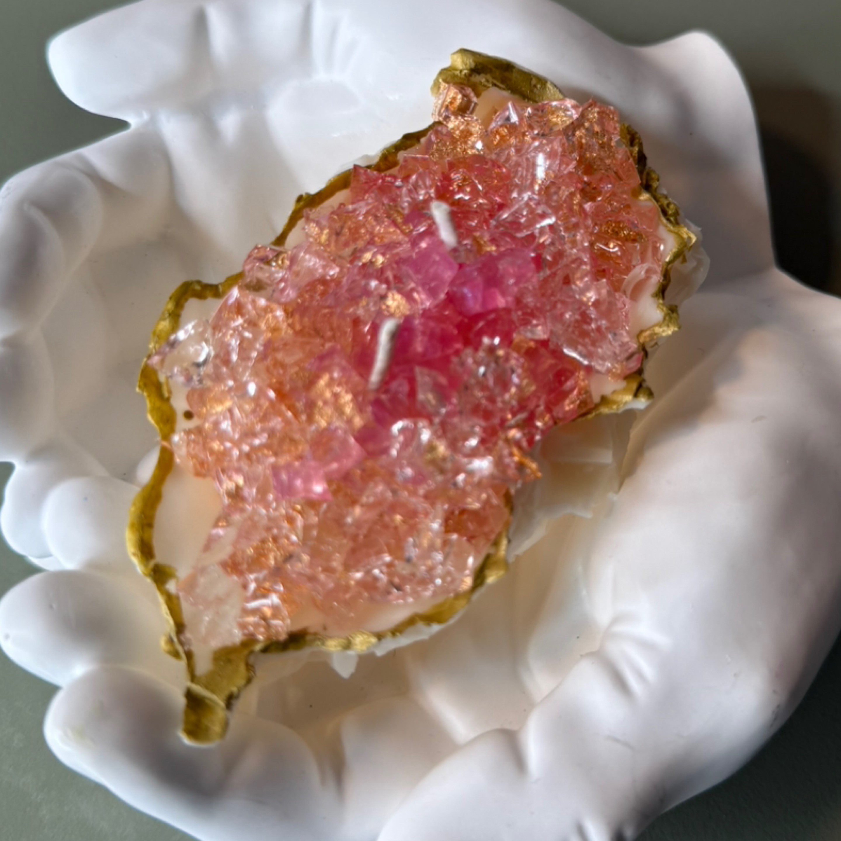 Hand-poured with care, this luxurious crystal candle features shimmering pink and peach crystal-like wax embeds, nestled in a gold-trimmed vessel. Designed to resemble a precious geode, it's both a statement piece and a calming scent experience. Perfect for gifting or elevating your sacred space.