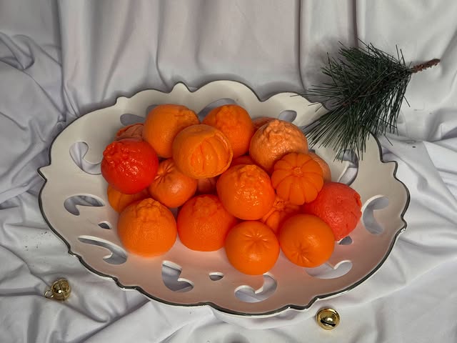 Handcrafted wax sculptures shaped like real citrus fruits, including tangerines, mandarins, and oranges. Each piece features realistic surface textures and natural dimples, making them look convincingly edible. The unique aspect is the variety of citrus forms blended together, giving the collection a playful, harvest-like arrangement.