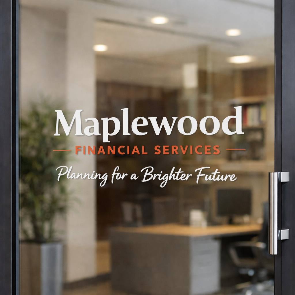 Custom-cut vinyl sticker applied to the glass door of a financial services office. Features clean typography and branding in a two-tone color scheme, with precision-aligned lettering for a polished, professional appearance.